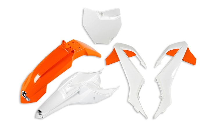 UFO Plast Verkleidungssatz für KTM-Modelle aus strapazierfähigem Polypropylen in Orange/Weiß. Robuster Schutz für Enduro und Motocross.