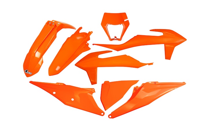 UFO Plast Verkleidungssatz für KTM, orange, aus hochwertigem Polypropylen mit extremer Langlebigkeit und Schutzfunktion.