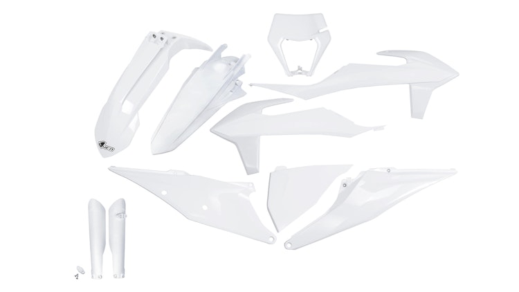 UFO Plast Verkleidungssatz für KTM SIX DAYS 2021-2022 in Weiß. Robustes Polypropylen mit hoher Strapazierfähigkeit für Enduro und Off-Road.
