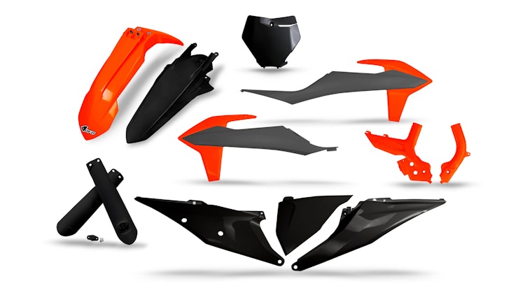 UFO Plast Verkleidungssatz für KTM-Modelle in Limited Edition Schwarz/Rot/Grau. Robustes Polypropylen für Enduro und Motocross.