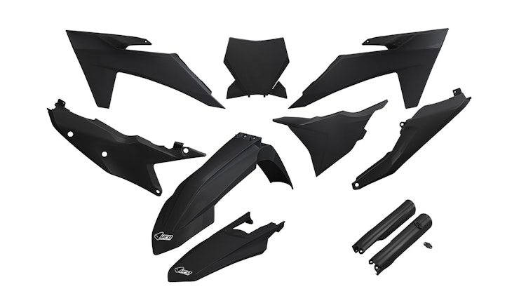 UFO Plast Verkleidungssatz für KTM-Modelle aus robustem schwarzem Polypropylen. Langlebige Schutzausrüstung für Enduro und Motocross.