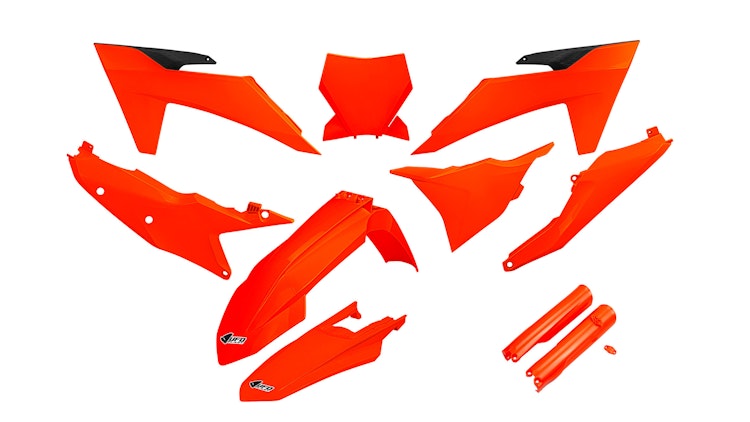 UFO Plast Verkleidungssatz für KTM in Orange. Hochwertiges Polypropylen, robust und langlebig für Enduro und Motocross.