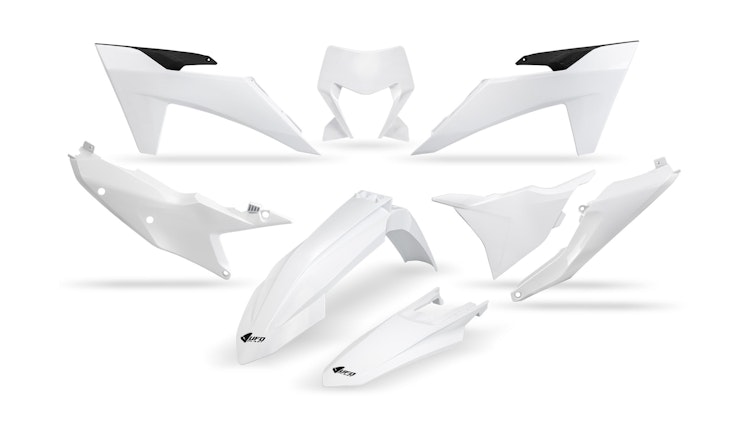 UFO Plast Verkleidungssatz für KTM in Weiß. Hochwertiges Polypropylen, strapazierfähig und langlebig. Idealer Schutz für Motocross und Enduro.