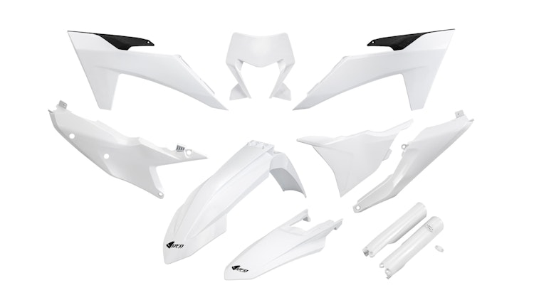 UFO Plast Verkleidungssatz für KTM-Modelle in Weiß. Hochwertiges Polypropylen, strapazierfähig und langlebig.