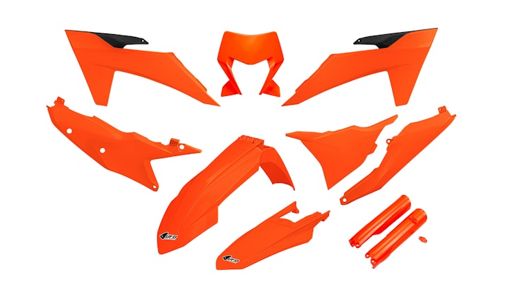 UFO Plast Verkleidungssatz für KTM-Modelle. Robustes Polypropylen, orange, perfekte Passform und hohe Langlebigkeit für Enduro und Motocross.
