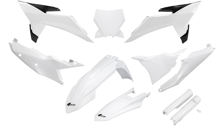 UFO Plast Verkleidungssatz für KTM-Modelle in Weiß-Schwarz. Strapazierfähiges Polypropylen mit hochwertiger Verarbeitung für Enduro und Motocross.