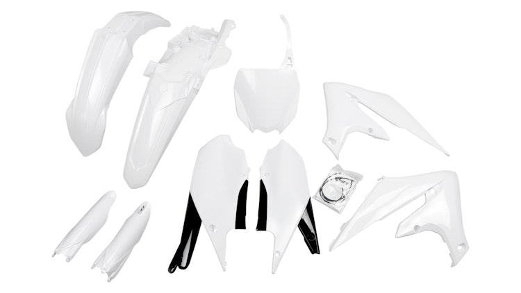 UFO Plast Verkleidungssatz für Yamaha mit Gabelprotektoren, weiß. Komplettes Set aus hochwertigem Polypropylen für Enduro und Motocross.