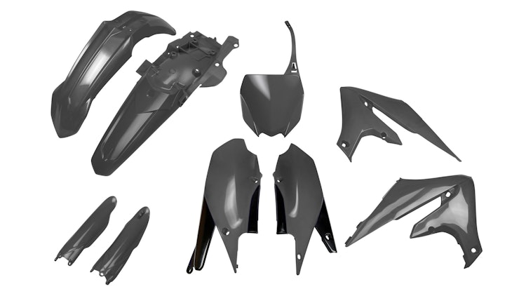 Material: Polypropylen (PP) | Farbe: grau, schwarz | Originalnummer: YAKIT321F-090 | EAN: 8052135174899 | Verpackungseinheit: 1 Satz | Inhalt: Startnummerntafel, Kühlerabdeckung, Seitenverkleidung, Kotflügel vorne, Kotflügel hinten, Gabelprotektoren