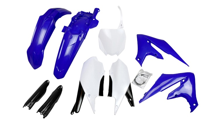UFO Plast Verkleidungssatz für Yamaha mit Gabelprotektoren. Hochwertiges Polypropylen, blau/weiß/schwarz, inkl. Kotflügel und Seitenverkleidung.