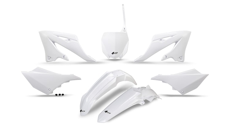 UFO Plast Verkleidungssatz für Yamaha in weiß – hochwertige Polypropylen-Qualität mit Startnummerntafel, Kühlerabdeckung und Kotflügeln für optimalen Schutz.