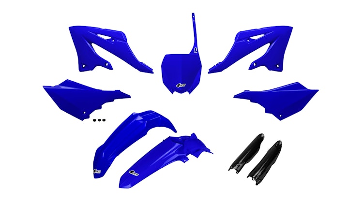 UFO Plast OEM Verkleidungssatz für Yamaha-Modelle in Blau/Schwarz mit Gabelprotektor. Robustes Polypropylen-Material für Enduro und Off-Road.