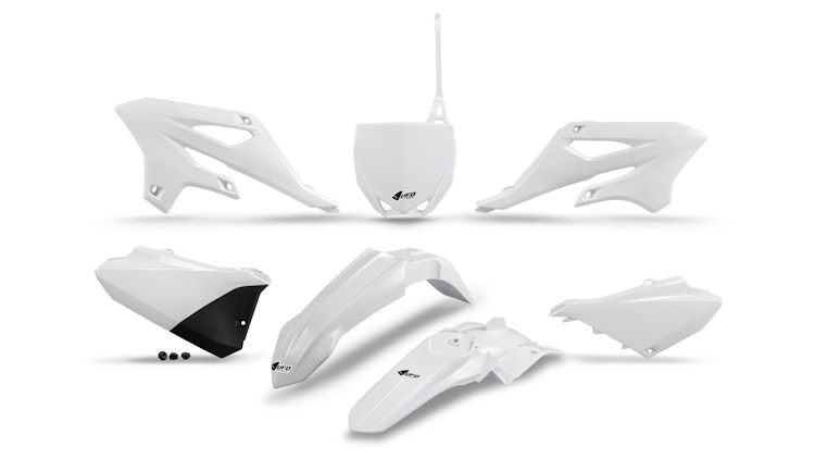 UFO Plast Verkleidungssatz in Weiß für Yamaha-Modelle. Strapazierfähiges Polypropylen mit Startnummerntafel, Kühlerabdeckung, Seitenverkleidung und Kotflügeln.