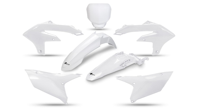 UFO Plast Verkleidungssatz für Yamaha Enduro/Motocross. Komplettset aus strapazierfähigem Polypropylen in Weiß. Inkl. Kotflügel, Seitenverkleidung und Kühlerabdeckung.